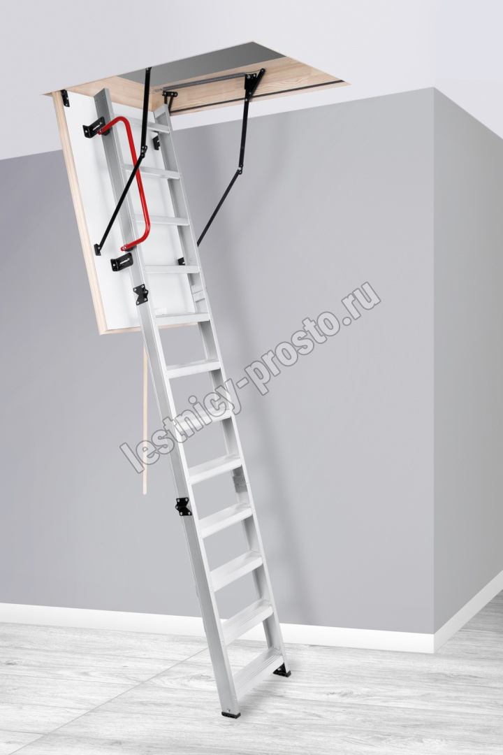 Складная 4-х секционная чердачная лестница. Рабочая поверхность полностью выполнена из алюминия. Термоизоляционная крышка типа "сэндвич" имеет усиленную теплозащиту, облицована с двух сторон ДВП белого цвета. По контуру короба имеется уплотнитель; Все металлические элементы лестницы покрыты порошковой краской.