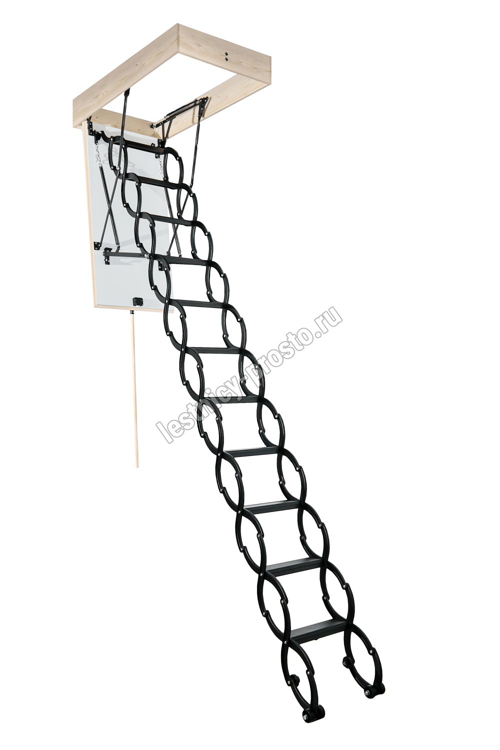 Материалы: корпус и утепленный люк из древесины хвойных пород с теплоизоляцией из пенопласта; ступени и тетивы из металла для максимальной прочности.