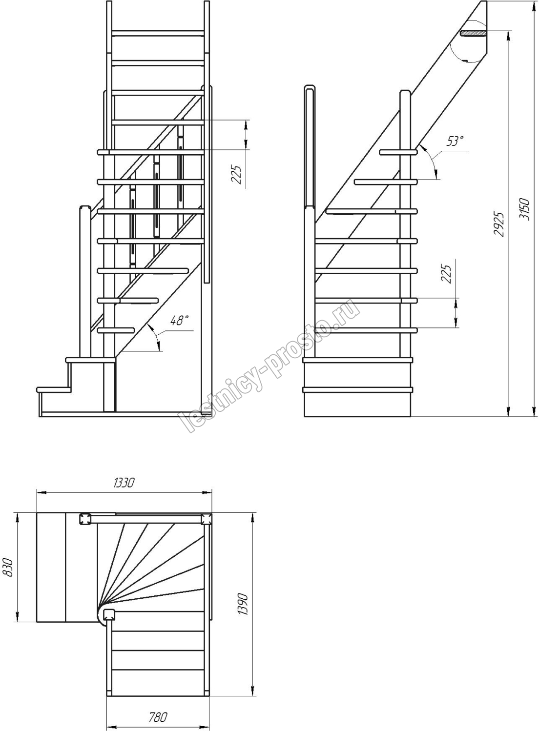 Деревянная межэтажная лестница ЛЕС-91 2925-3150 проем 1390-780, Бук