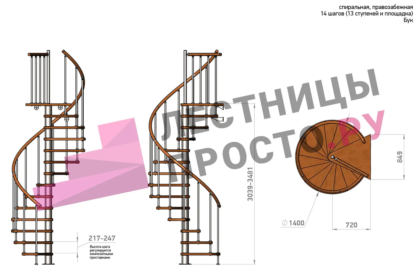 Правая, d=140см, 13 ступеней + площадка
