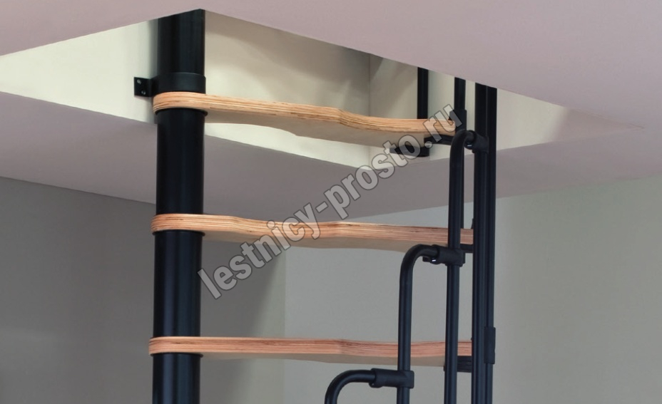 Компактная надёжная лестница. Ступени толщиной 30 мм, изготовлены из массива берёзы по технологии Multiplex, лакированные. Все металлические части оцинкованы горячим способом и покрыты порошковой краской - черного цвета; Лестница имеет надёжную несущую стальную конструкцию.