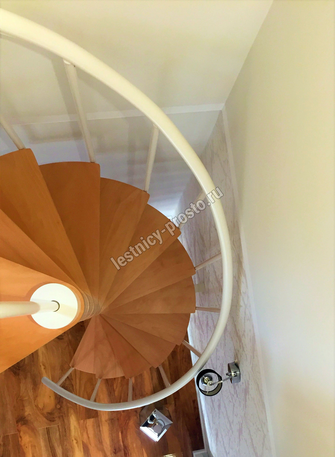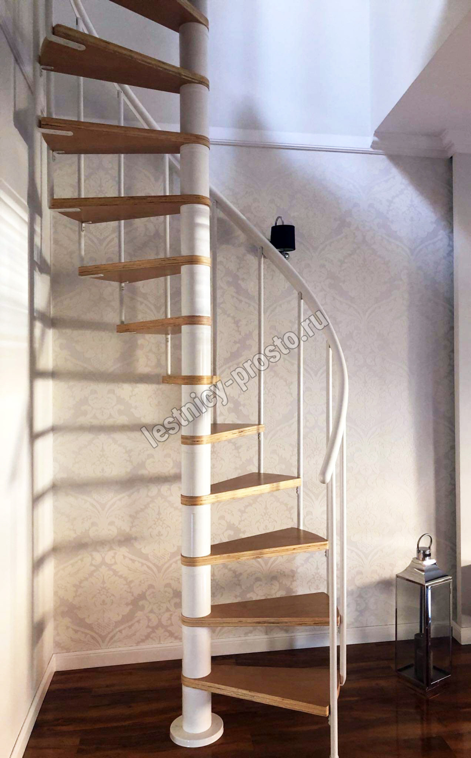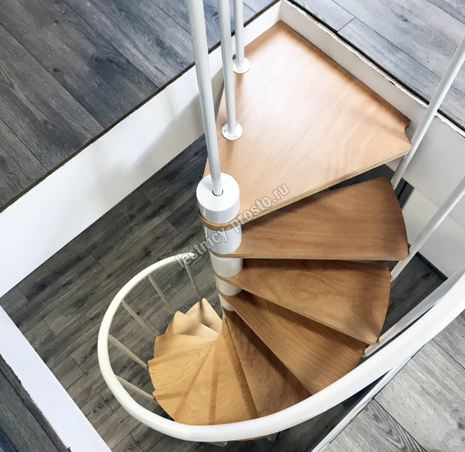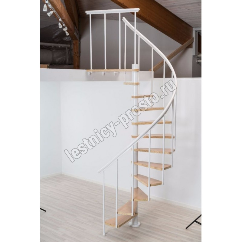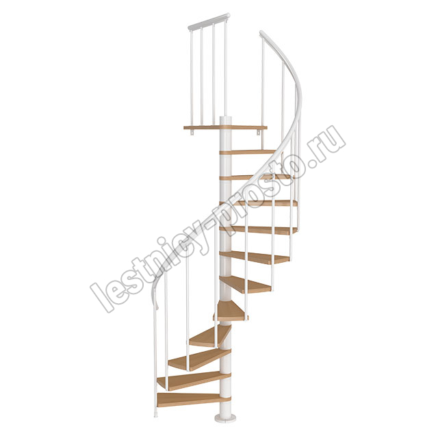 Ступени лестницы изготовлены из бука по технологии MULTIPLEX и покрыты износостойким защитным лаком. Лестница монтируется как по часовой стрелке, так и против. Возможен монтаж в круглый или квадратный проём. Ограждение: стальные трубки, Ø25 мм RAL 9016. Поручень: гибкий цельный ПВХ-поручень Ø40 мм белого цвета. Конструкция и балюстрада окрашены порошковым способом в белый цвет (RAL 9016).